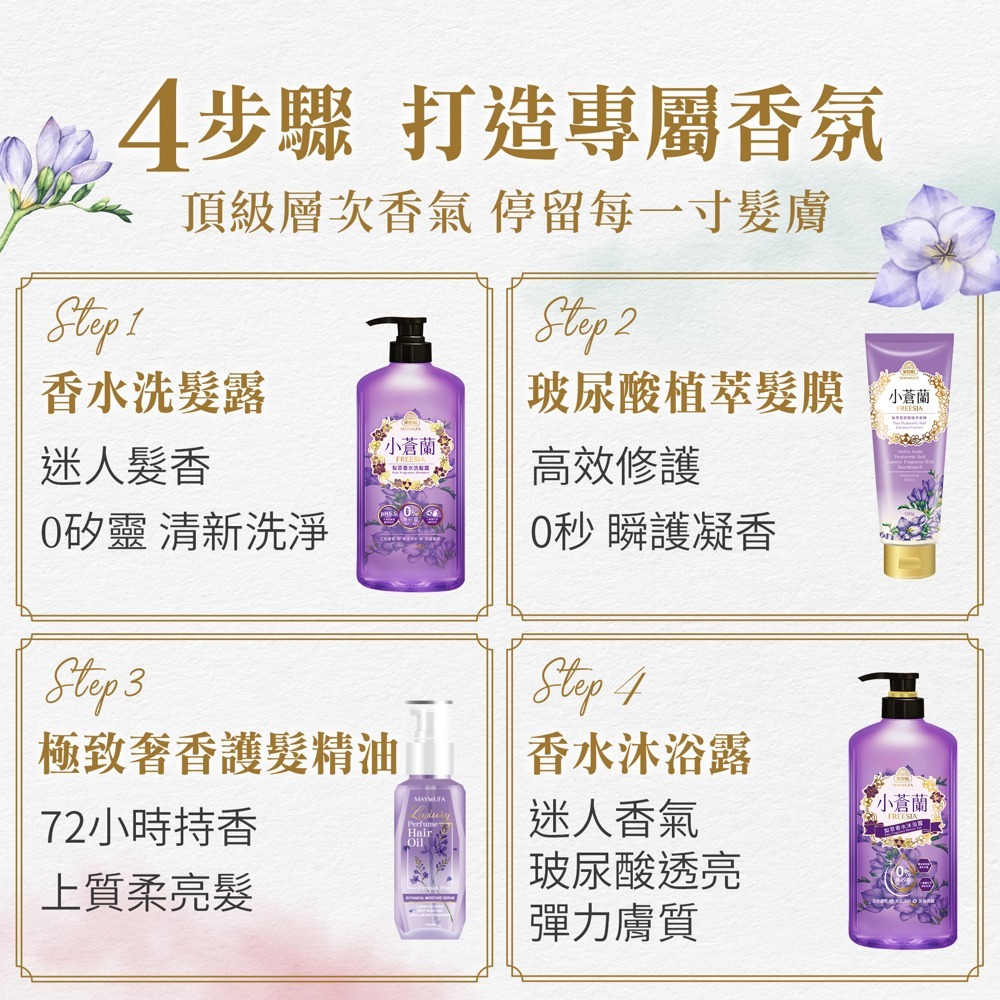 美吾髮香水系列 小蒼蘭極致奢香護髮精油,選用珍稀花萃精華,山茶花籽油、摩洛哥堅果油、巴西魯木果油等,瞬間修護受損乾澀髮絲;小蒼蘭、西洋梨、鈴蘭、玫瑰等精品香調,多層次綻放香氣,完美持香72小時,一瓶打造上質柔亮迷人秀髮。