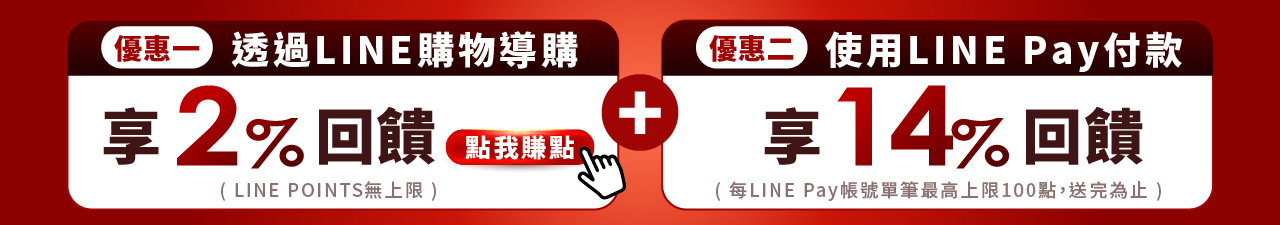 優惠一:消費前經由LINE購物指定連結頁面導購,享LINE POINTS 2%回饋!
