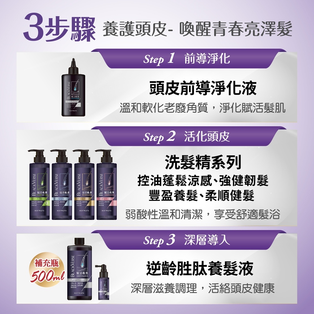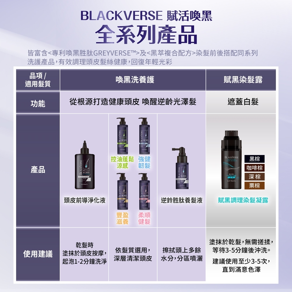 淨化液、洗髮精、養髮液均不是染髮劑,所以沒有上色效果。如果需要染髮上色效果可使用《賦活喚黑 賦黑調理染髮凝露》