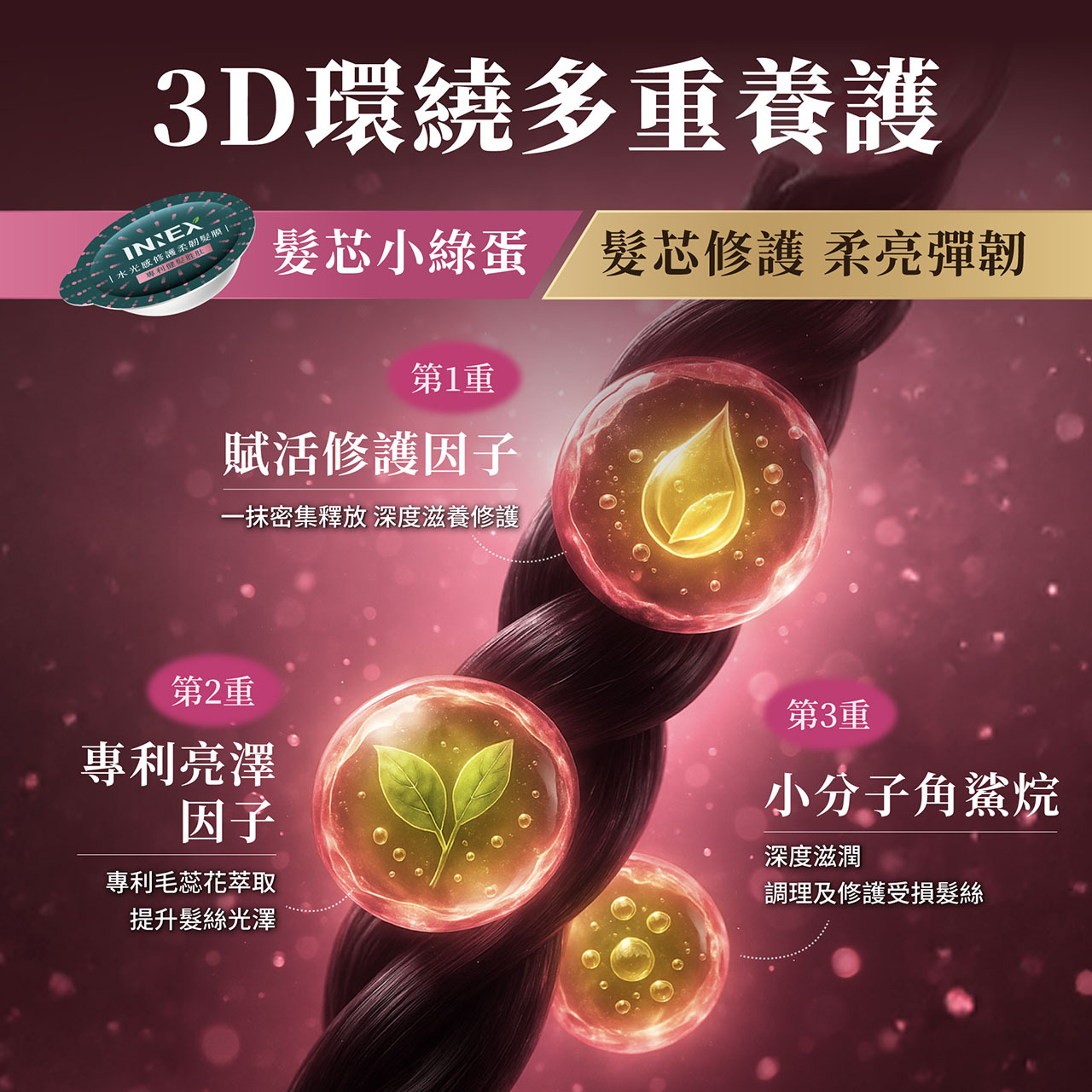 *添加小分子角鯊烷,迅速吸收深度滋潤,修護及強化受損髮絲