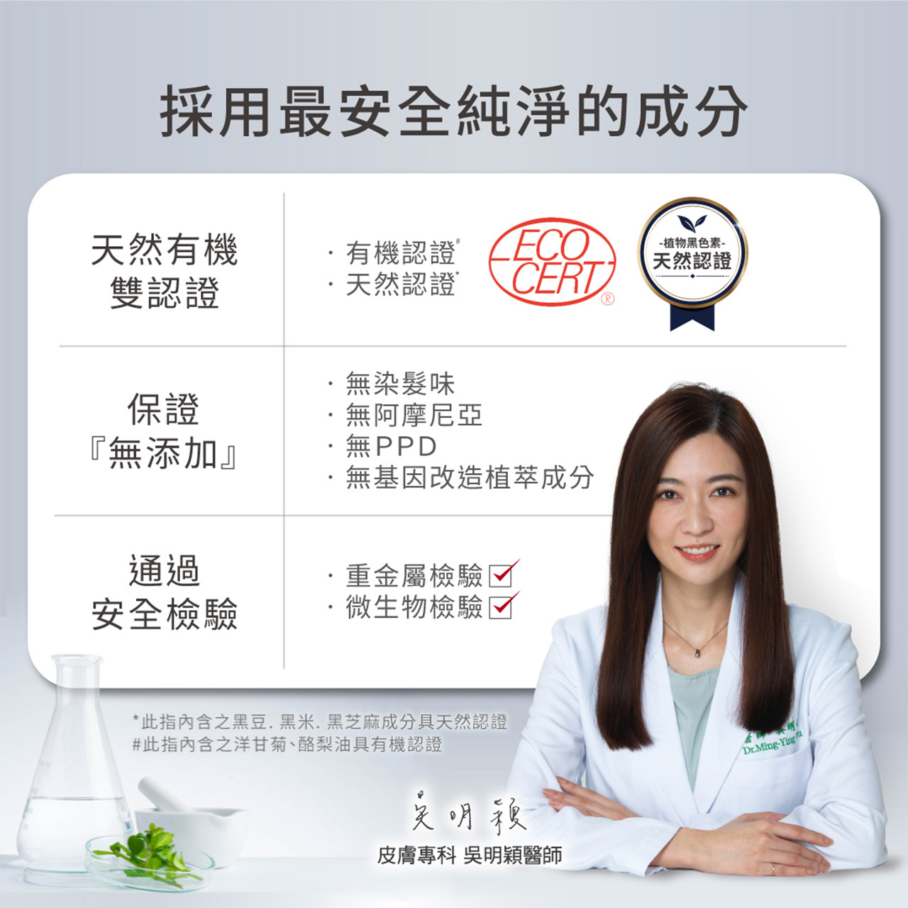 採用天然認證的安心的植物黑色素成分,溫和上色,髮絲柔順0負擔。無添加PPD及阿摩尼亞,散發植萃輕香。