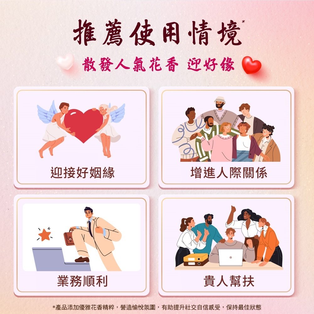 廣結善緣: 注入桃花蕾、依蘭花與月光石精華,讓您身心和諧、提升人際魅力,開啟「心花開」的好運勢。