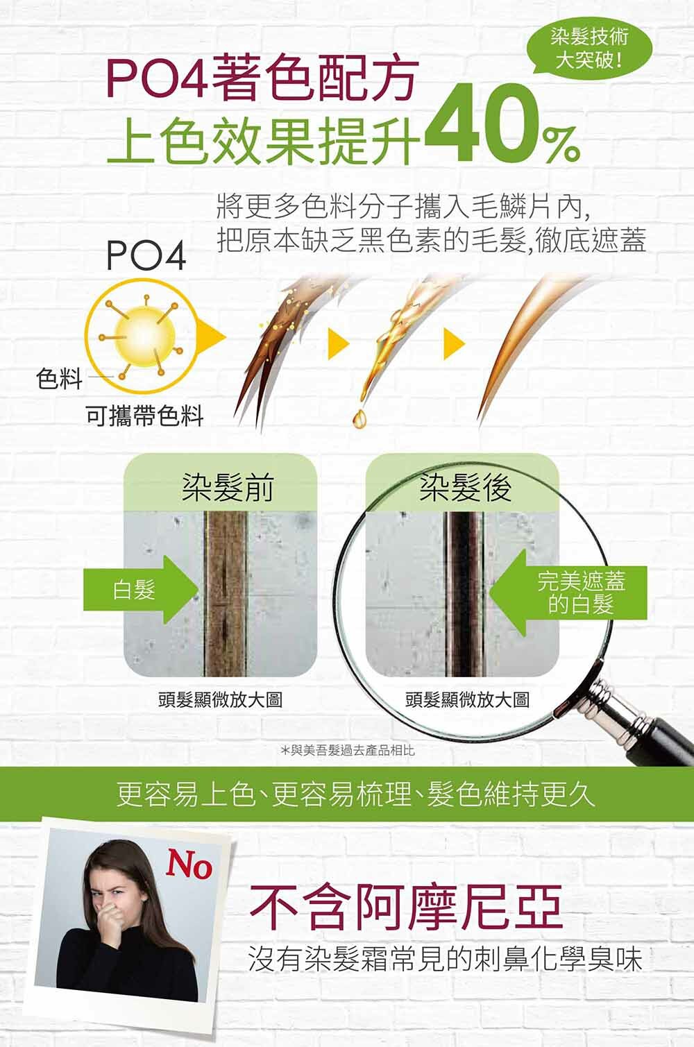 包裝及圖文髮色僅供參考,個人染髮髮色會因染前深淺度、髮質、頭髮受損程度、室溫、染劑用量、染劑停留於頭髮放置時間長短而有所差異,每人實際染出之果不同屬正常現象。