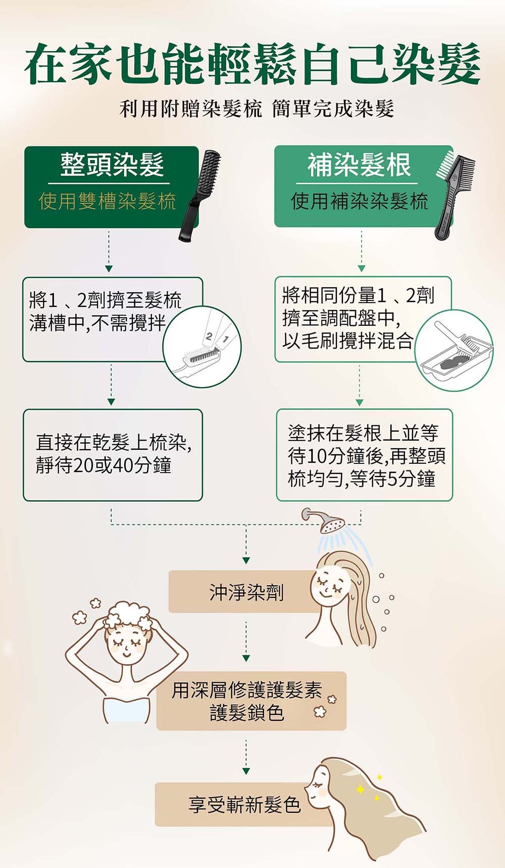 包裝及圖文髮色僅供參考,個人染髮髮色會因染前深淺度、髮質、頭髮受損程度、室溫、染劑用量、染劑停留於頭髮放置時間長短而有所差異,每人實際染出之果不同屬正常現象。