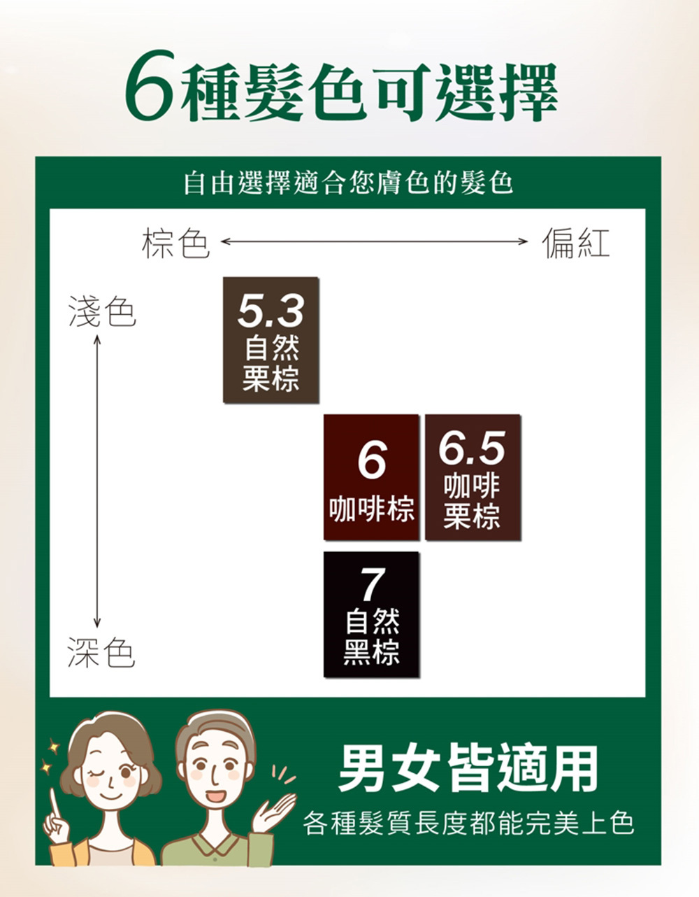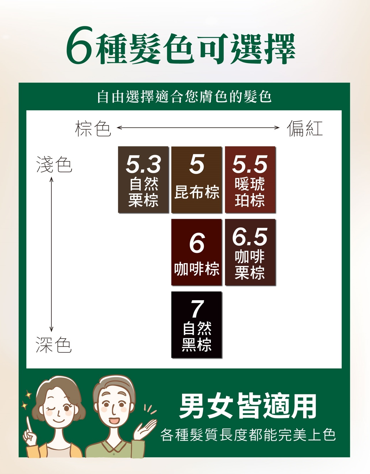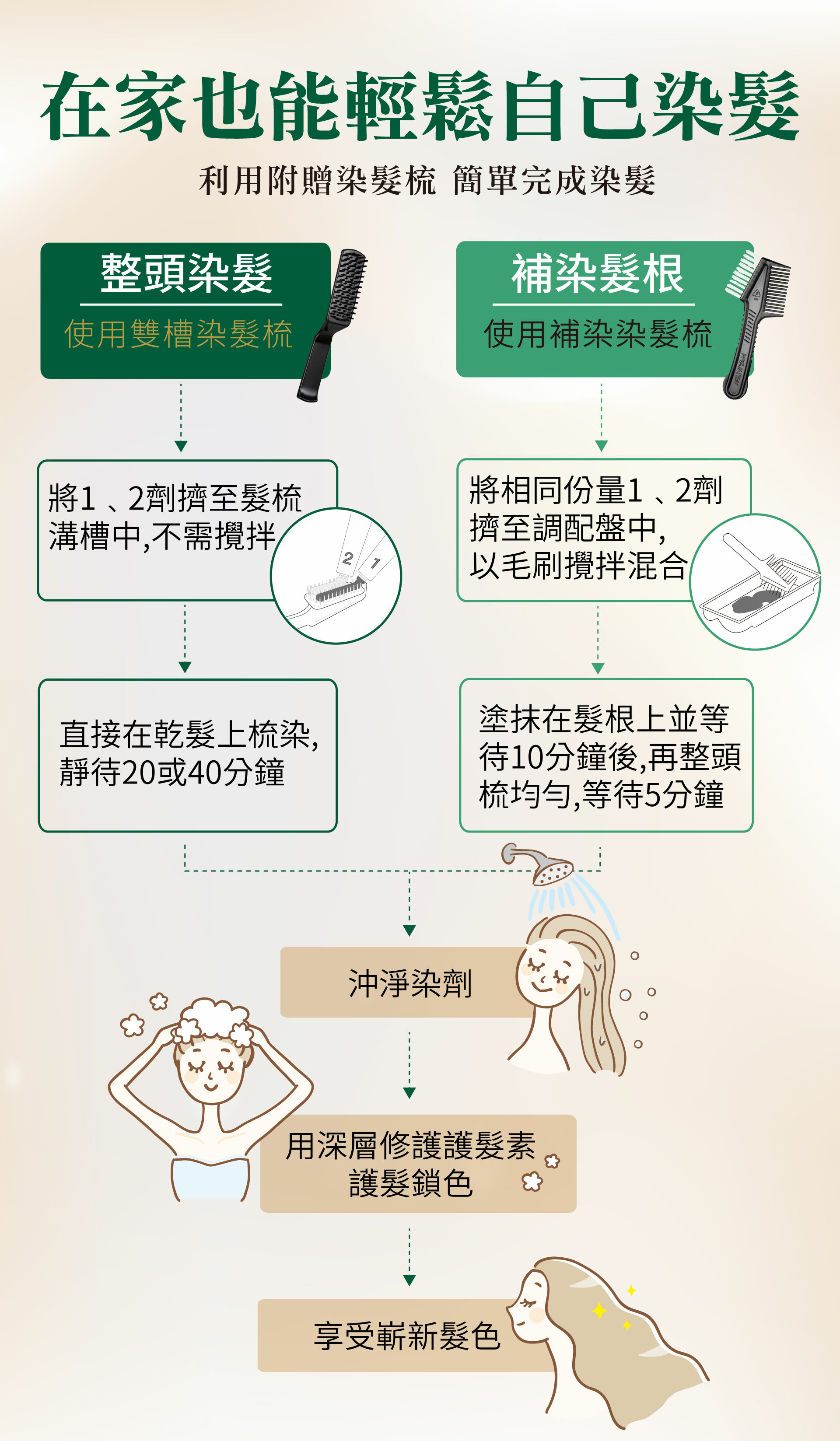 包裝及圖文髮色僅供參考,個人染髮髮色會因染前深淺度、髮質、頭髮受損程度、室溫、染劑用量、染劑停留於頭髮放置時間長短而有所差異,每人實際染出之果不同屬正常現象。