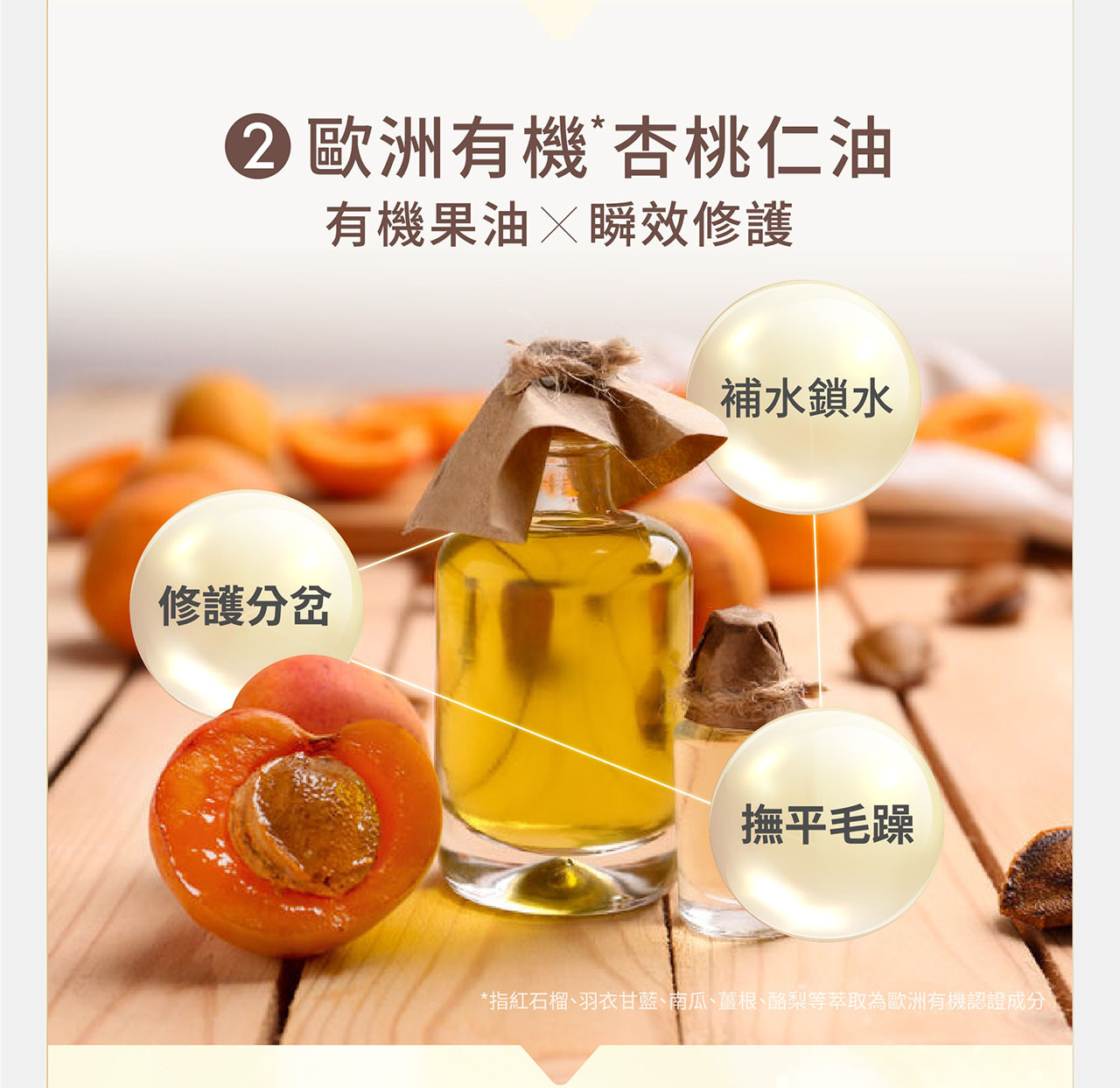 使用Ecocert有機認證的天然、非基改「酪梨果油」及「摩洛哥堅果油」,有效滋養潤澤毛躁受損髮芯,使秀髮柔順健康閃耀。毆盟Cosmos認證「甜菜根」具有保濕和豐富的維生素,有助於恢復彈性,對抗熱傷害並維持髮色光澤。添加超級綜合維他命B3、B5 、C、E、B6等豐富維他命,從髮根開始注入營養,維持頭皮健康,增加髮絲強韌度。