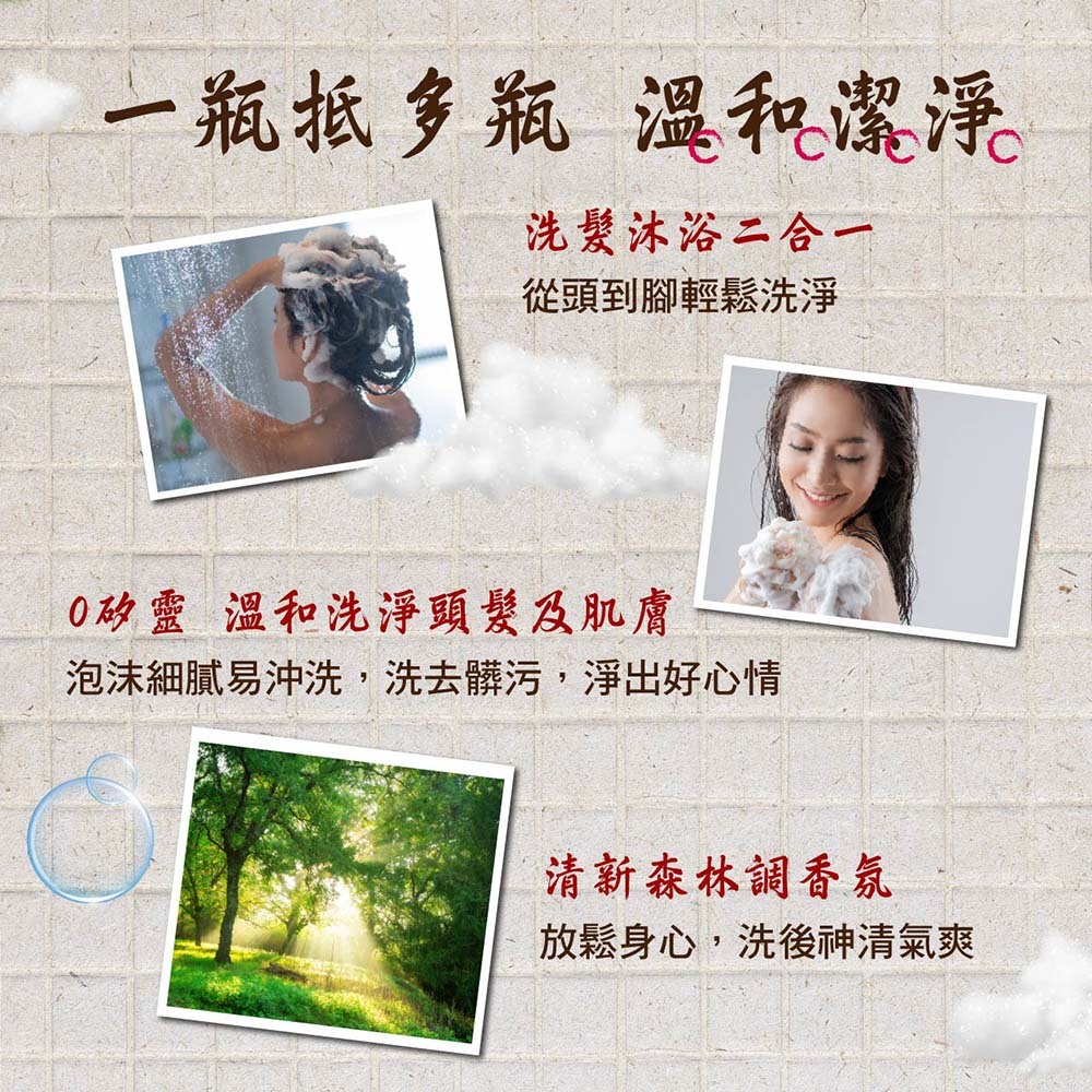 從頭到腳的淨化 洗髮沐浴二合一,輕輕鬆鬆洗去全身汙垢疲憊,幫助身心放鬆舒眠