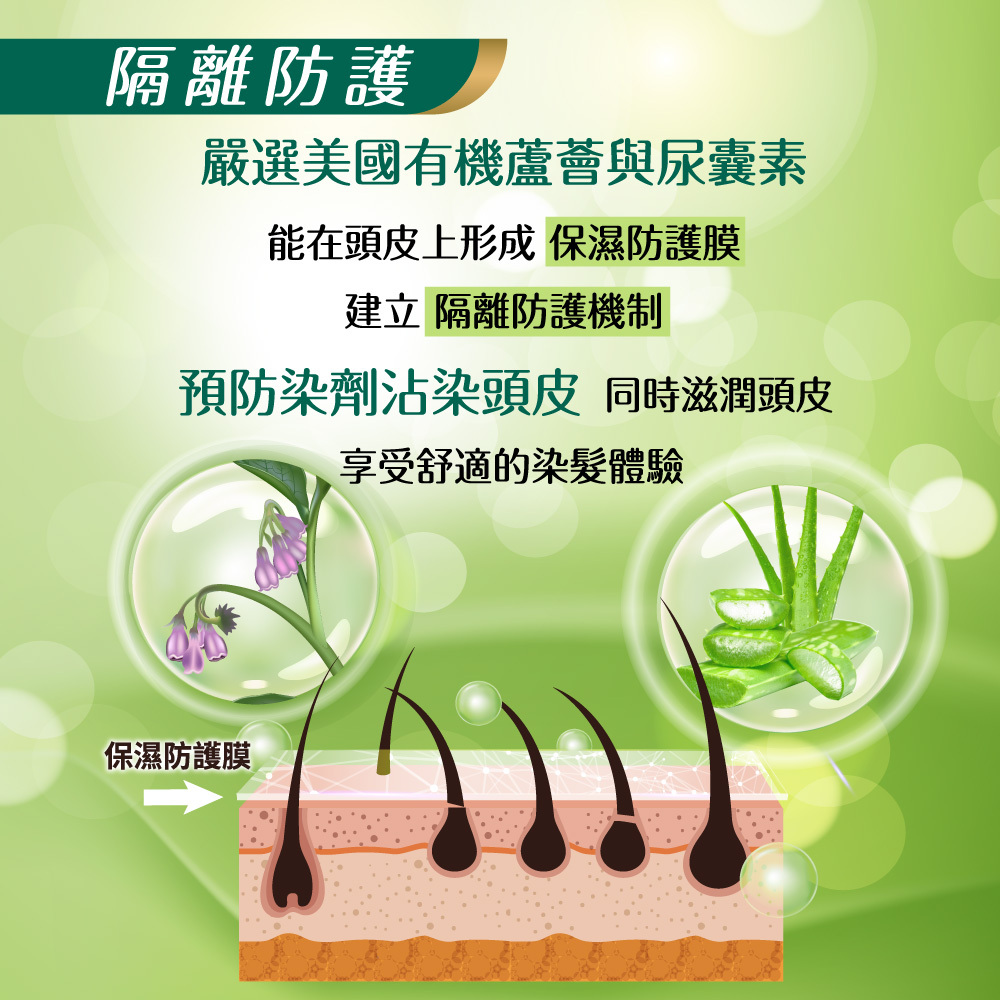 1. 添加美國有機蘆薈與尿囊素,能在頭皮上形成保濕防護膜, 預防染劑沾染頭皮, 同時滋潤頭皮, 享受舒適的染髮體驗