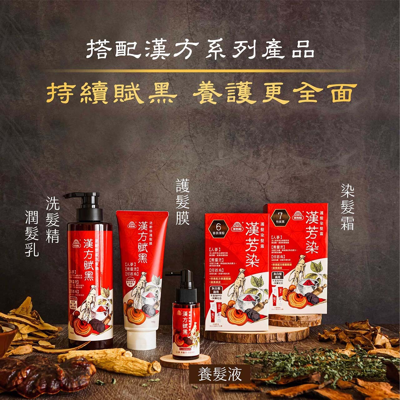 特選漢方人蔘、五味子、黑靈芝、何首烏,滋補每吋珍貴髮絲。無PPD、無阿摩尼亞、無化學異味