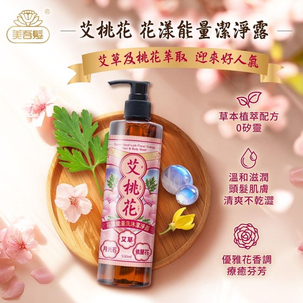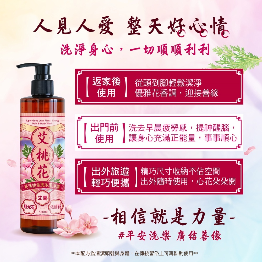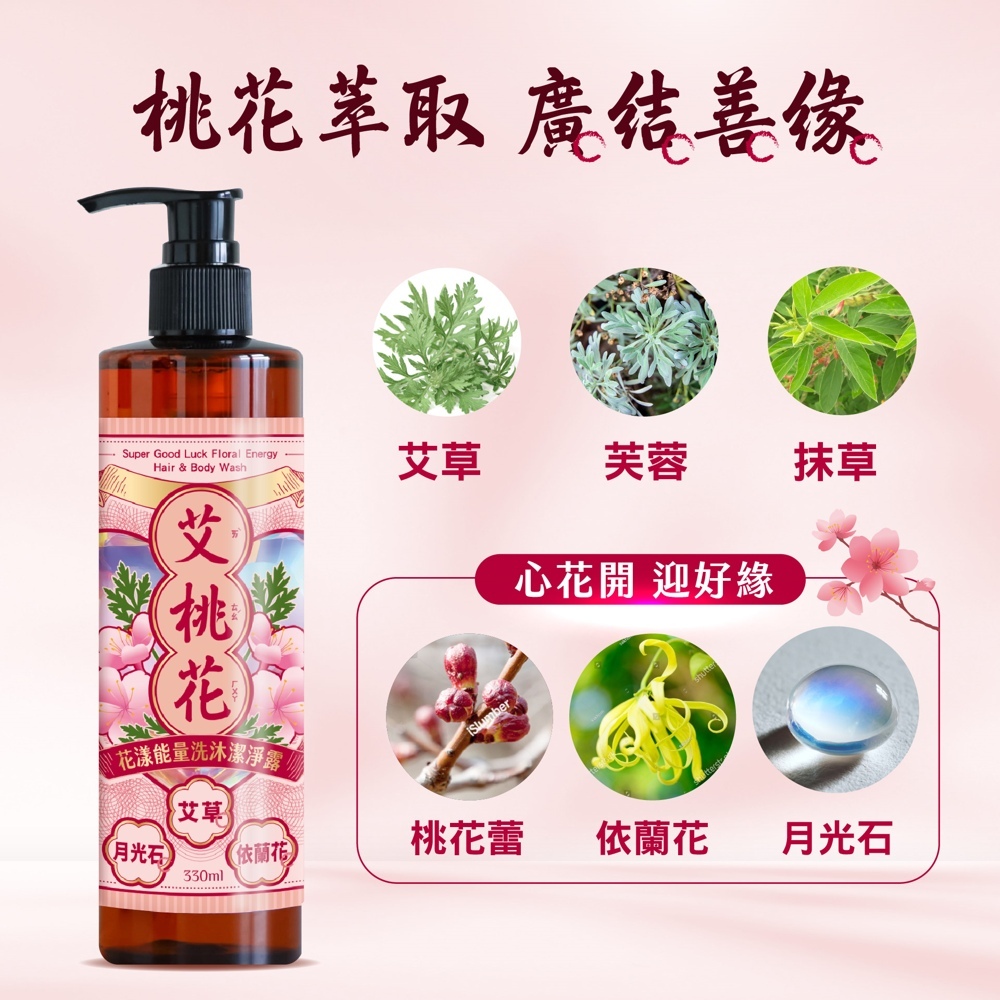 艾桃花 花漾能量洗沐潔淨露-桃花萃取 廣結善緣,艾草、抹草、芙蓉 全面淨化,添加桃花蕾、依蘭花、月光石,迎好運!