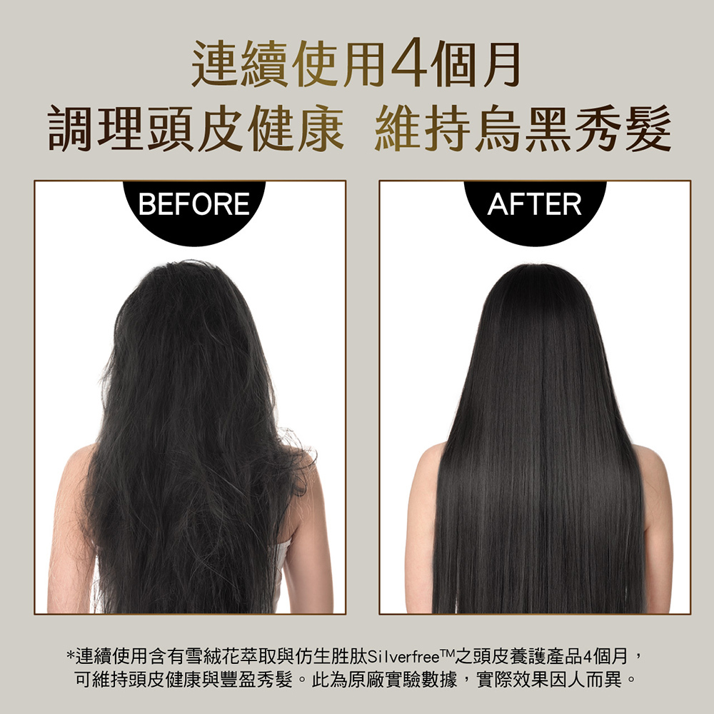 珍貴雪絨花萃取,注入滋養能量,使秀髮烏黑亮澤。特別推薦灰白髮者適用。專利仿生胜肽Silverfree™,滋養髮根,展現自然健康亮麗髮色。專利滋養及保水成分,保水並調理舒緩,養出健康頭皮環境,青春自然烏黑髮色亮麗呈現。