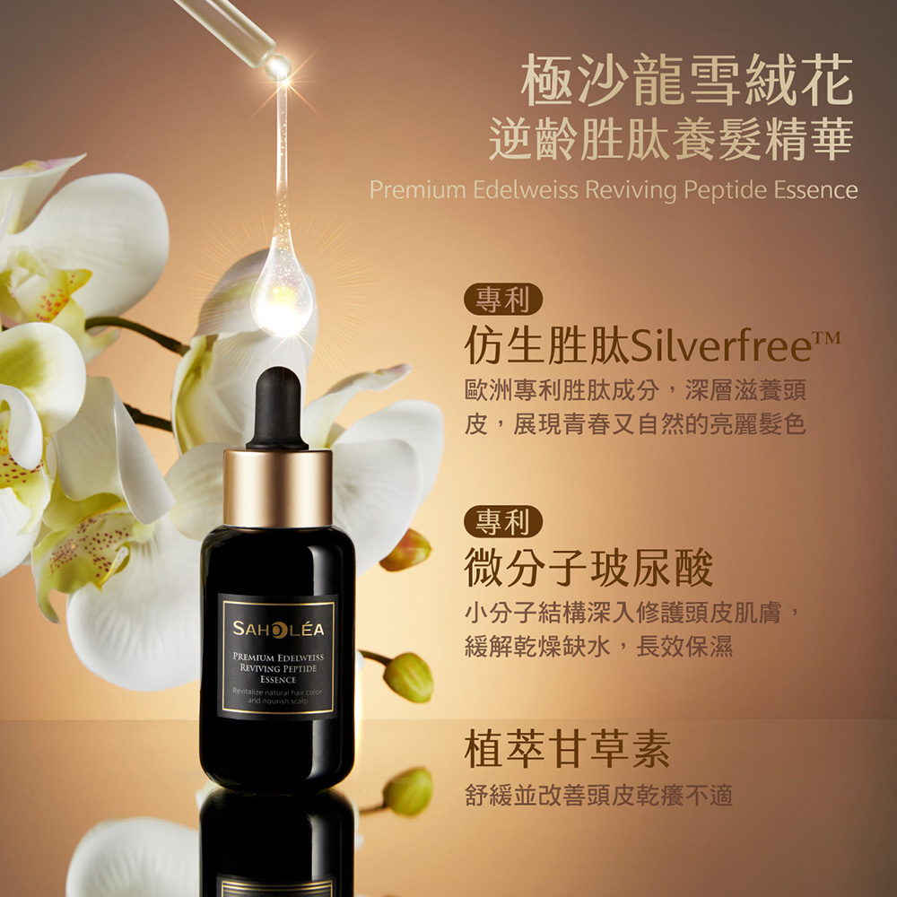 珍貴雪絨花萃取,注入滋養能量,使秀髮烏黑亮澤。特別推薦灰白髮者適用。專利仿生胜肽Silverfree™,滋養髮根,展現自然健康亮麗髮色。
