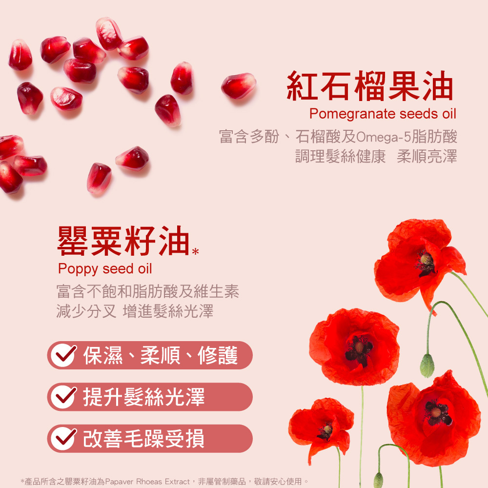 紅石榴及罌粟花植物萃取精華油,深層修護受損髮芯,撫平毛躁髮絲
