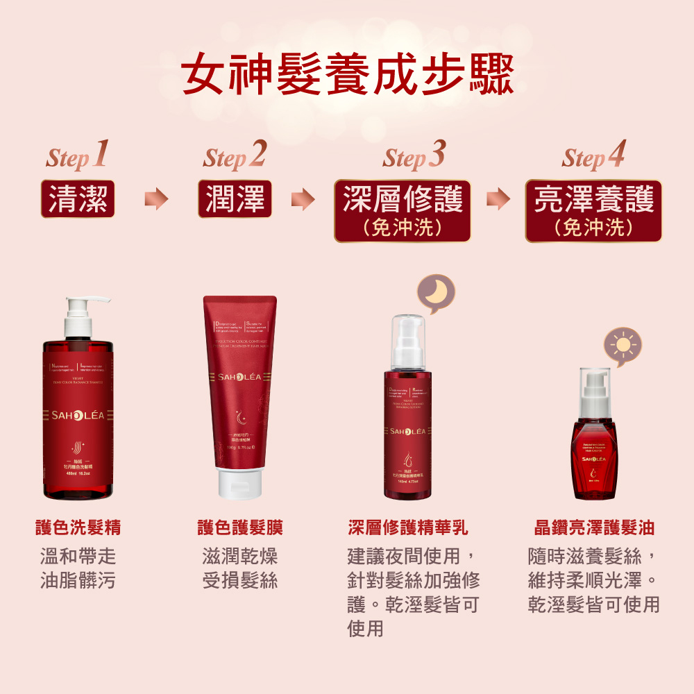 牡丹花萃精華萃取,修護髮絲及維持顯色與光澤,使髮絲呈現極致亮澤。