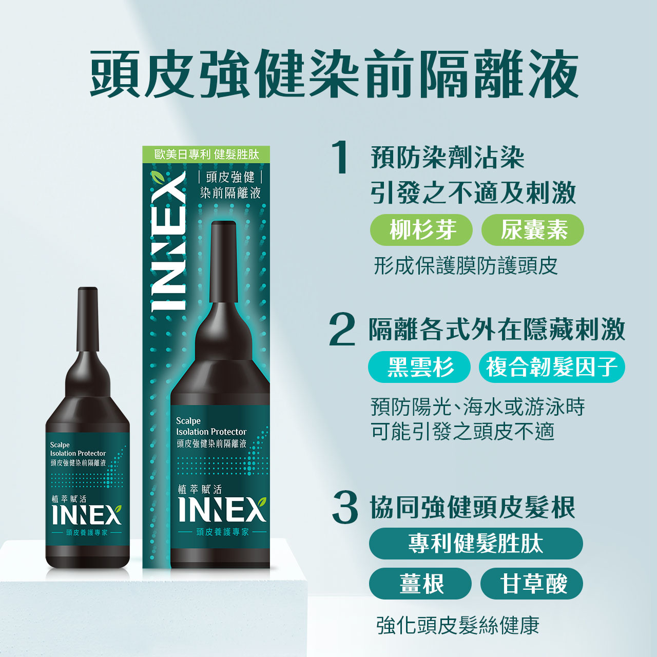 《INNEX植萃賦活 頭皮強健染前隔離液》染髮前溫和隔離防護頭皮,預防染劑沾染,隔離各式外在刺激,提升頭皮防禦力;添加專利健髮胜肽,同時活絡強健頭皮。