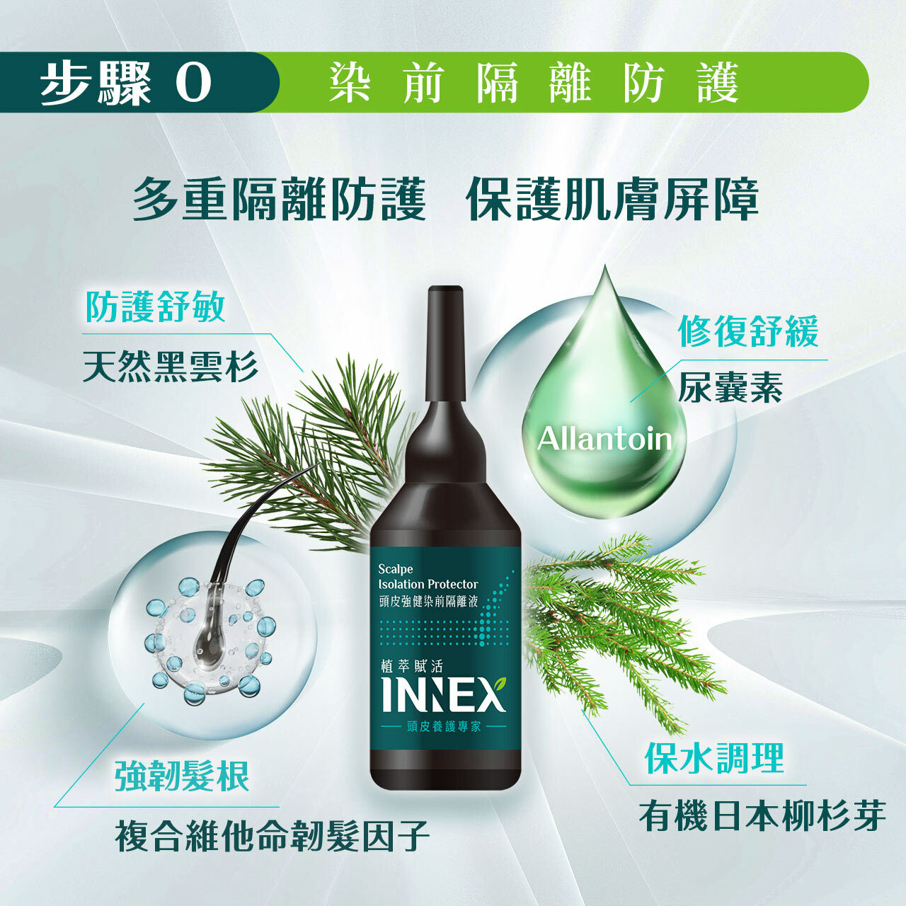 精選維他命韌髮因子、尿囊素、有機日本柳杉芽及天然黑雲杉,隔離保護肌膚屏障,預防染劑沾染頭皮,調理頭皮健康平衡