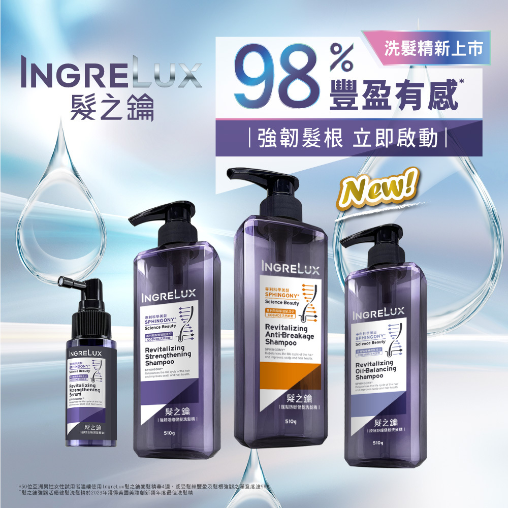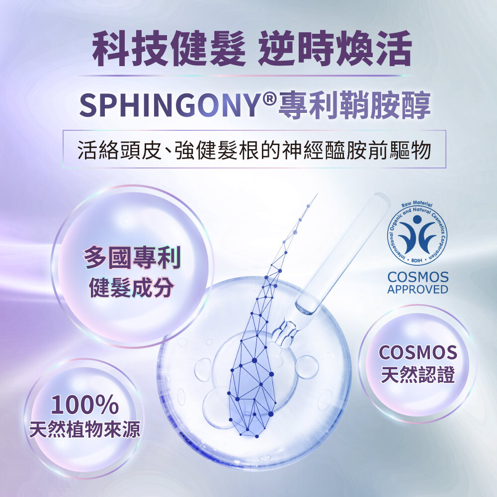 SPHINGONY®專利鞘胺醇,為100%天然植物來源,擁有6國專利及COSMOS天然認證的神經醯胺前驅物活性成分,活絡頭皮、強健髮根,呈現豐盈秀髮