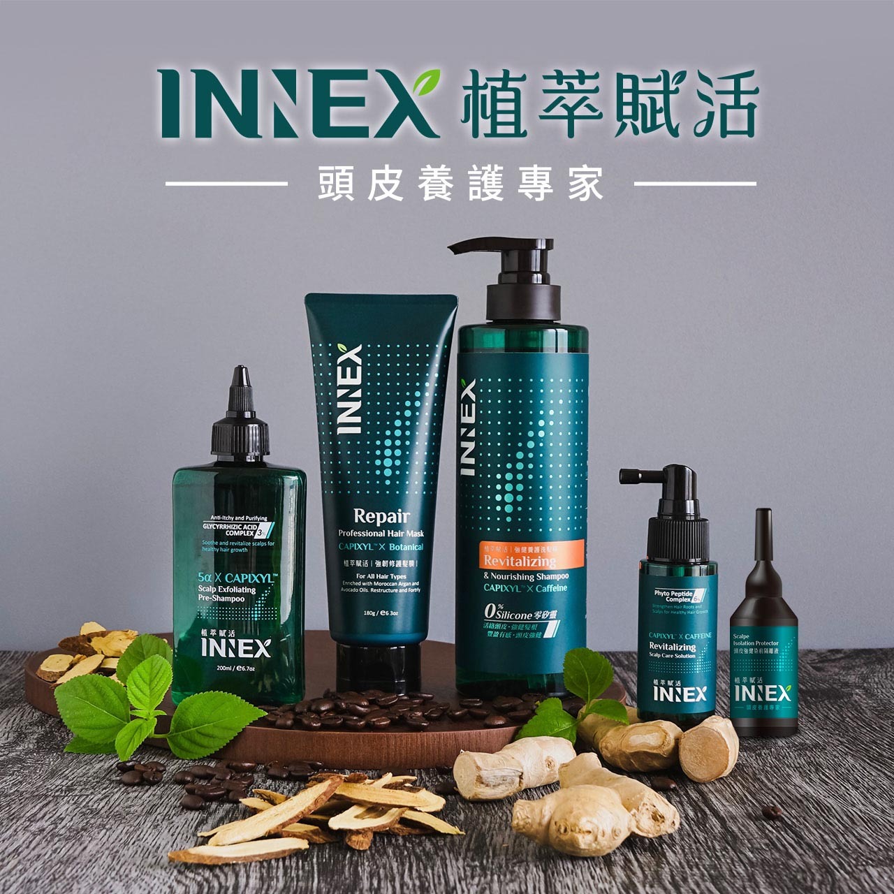 《INNEX植萃賦活 頭皮強健染前隔離液》染髮前溫和隔離防護頭皮,預防染劑沾染,隔離各式外在刺激,提升頭皮防禦力;添加專利健髮胜肽,同時活絡強健頭皮。