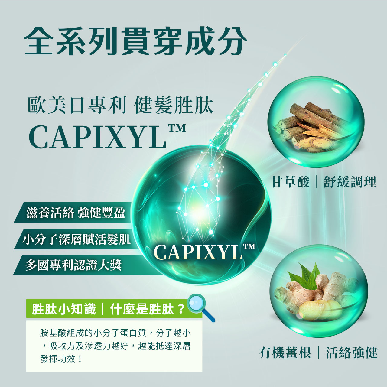 歐美日專利CAPIXYL™健髮胜肽、有機薑根及甘草酸複合物,隔離同時注入強健滋養成分,強韌髮根