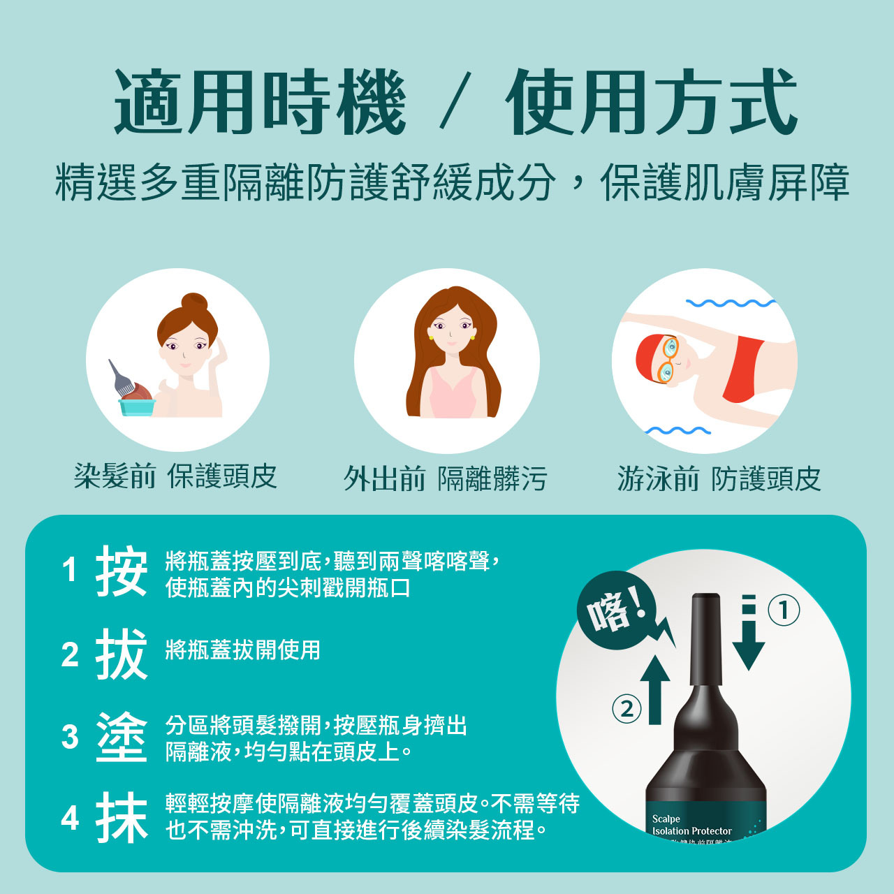 染髮前保護頭皮、外出前隔離髒汙或游泳前防護頭皮皆適用