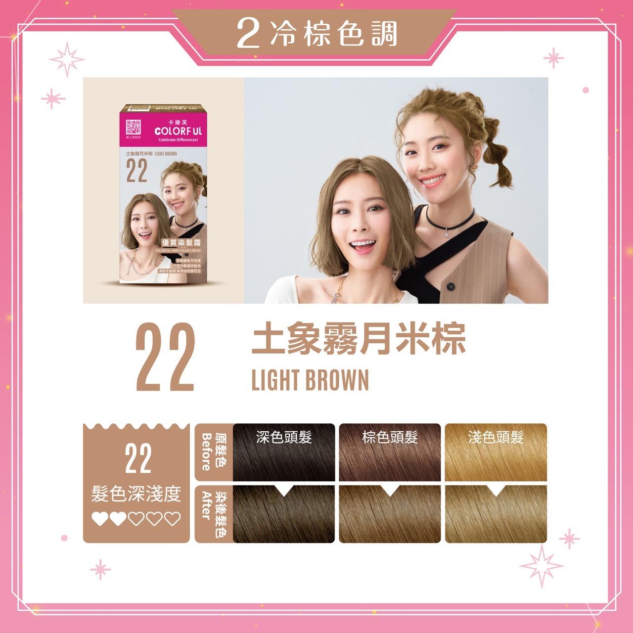 包裝及圖文髮色僅供參考,個人染髮髮色會因染前深淺度、髮質、頭髮受損程度、室溫、染劑用量、染劑停留於頭髮放置時間長短而有所差異,每人實際染出之果不同屬正常現象。
