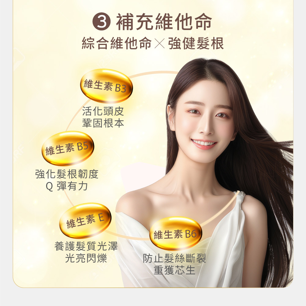 添加超級綜合維他命B3、B5 、C、E、B6等豐富維他命,從髮根開始注入營養,維持頭皮健康,增加髮絲強韌度。