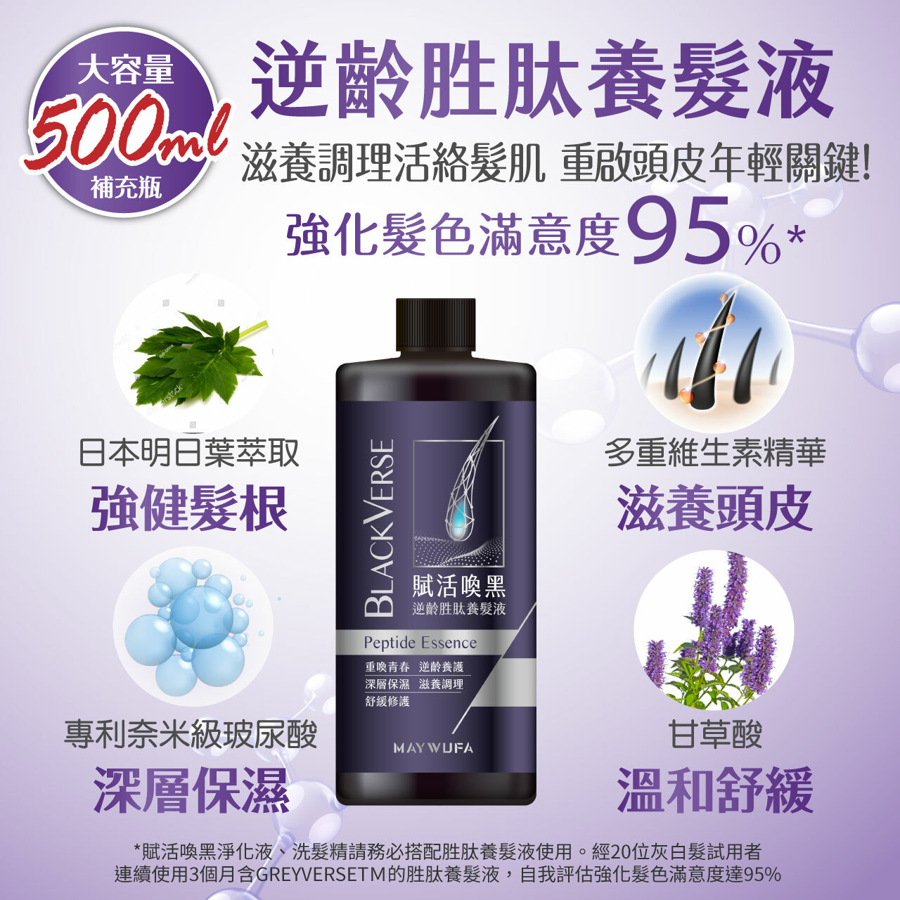 養髮液使用方式:洗完頭吹頭髮前,在頭髮半乾的狀態下將頭髮分成六區,將養髮液均勻噴灑在頭皮及髮根(每區至少噴六下),再以指腹按摩直至頭皮吸收後,將頭髮吹乾即可。每天需使用一次,一瓶約可用半個月,至少連續使用三個月,建議搭配同系列洗護髮產品效果更佳。實際因個人使用方式及頭皮狀況而異。