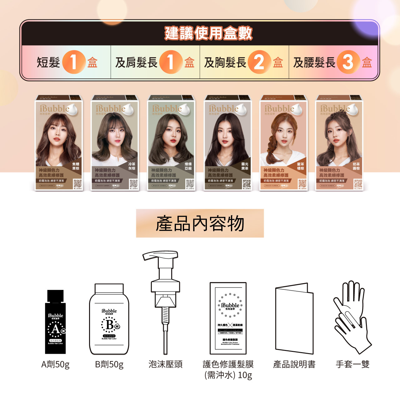 *髮量較多者建議多備1盒,以上皆為建議使用量,供您評估個人髮長及髮量購買參考。泡沫染髮劑型無法分次保留使用,一旦開封請立即使用完畢,若未用完請丟棄。
