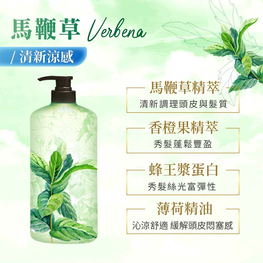 涼感薄荷,洗後頭皮清新暢快!馬鞭草與香橙果鮮明的氣息,經典法式香調,讓人徜徉於清新自然香氛中。0矽靈,無添加人工色素、無添加PARABENS,近pH5.5弱酸溫和配方